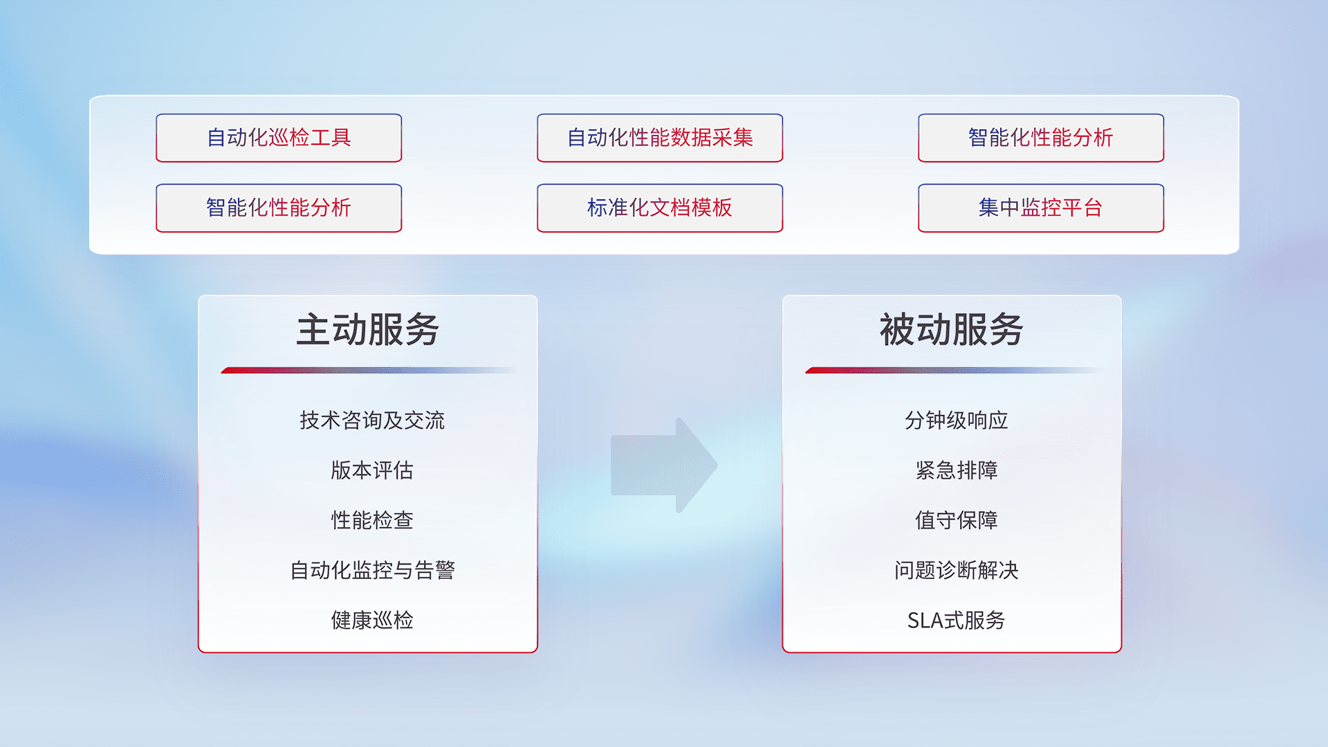智能化工具和标准化文档,,保障服务质量,,,,提供主动服务(包含技术咨询、、、版本评估、、性能检查、、、、自动化监控与告警、、健康巡检)和被动服务包含(分钟级响应、、、紧急排障、、值守保障、、、问题诊断解决、、、、SLA服务)。。